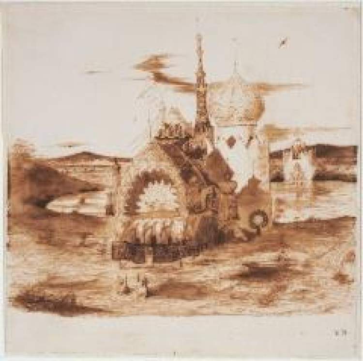 雨果身处十九世纪的法国,却一直关注东方文化,尤其对中国情有独钟。他早期的绘画创作中就有一组“东方幻想画”,描绘他想象中的东方景观、中国建筑和人物,甚至有些建筑上的铭文都在模仿中国汉字。