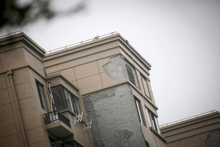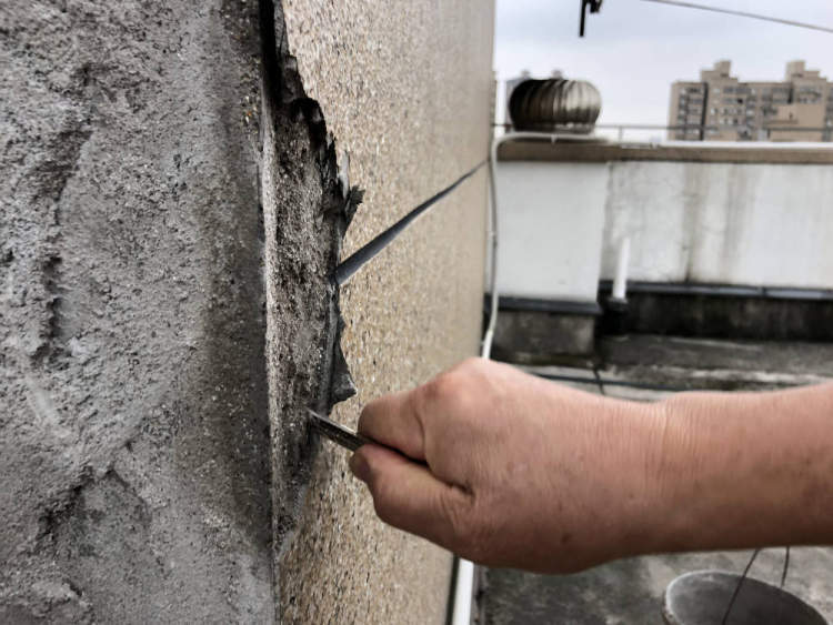 楼顶上,不少脱落的外墙碎片还未清理,沿着墙面残缺的地方,陆先生用钥匙轻轻一拨,就撬掉了一块墙皮的碎片。