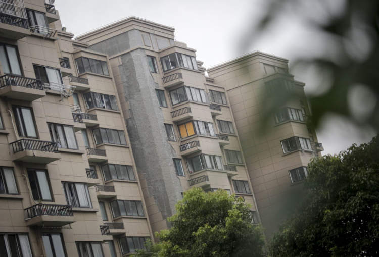 小区里部分居民楼的墙面甚至还没来得及修补,灰色的水泥直接裸露在外,与原本棕黄色的墙面形成鲜明对比,严重的地方灰色和棕黄色的墙面,各占了一半。