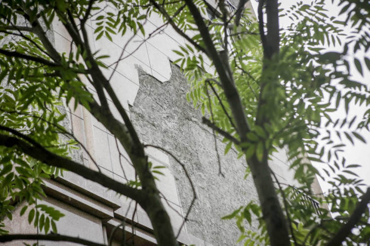 记者看到,小区里的楼房整体呈棕黄色,每栋楼无一例外都有修补的痕迹,修补的地方呈深棕色,像大大小小的“补丁”,贴在墙上。
