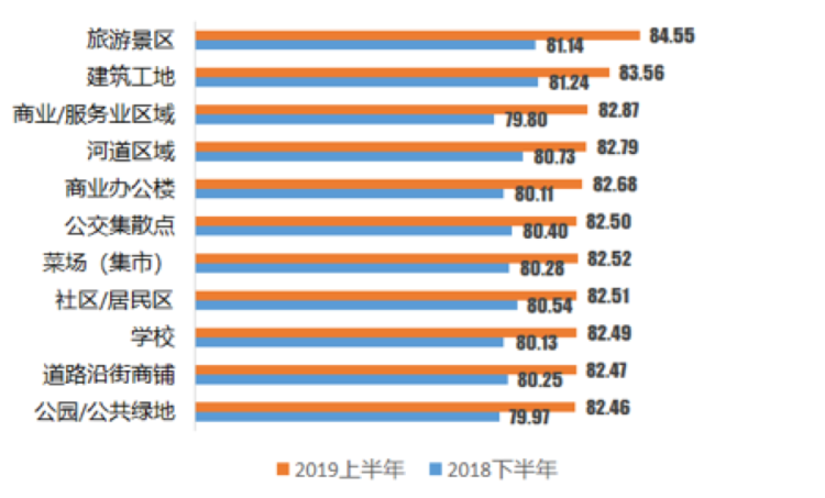 测评结果显示,与2018下半年相比,11类受访地点综合评分均有上升。其中,受访对象对“旅游景区”满意度最高,对“道路沿街商铺”以及“公园、公共绿地”满意度较低,详见图表3。