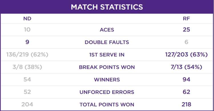 从上面这张技术统计可以看出,费德勒除了非受迫性失误比德约科维奇多了10个,其他各主要项目全都领先。最难得的是,费德勒的一发得分率五盘比赛全部高于72%。