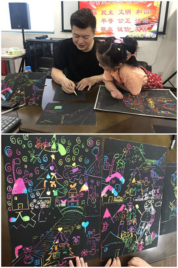 祥德居委文教干部请来美术沈老师为同学们上了一堂艺术刮画课。沈老师准备好刮画纸和竹笔。刮画纸是一种双层艺术类纸品,上层主要为黑色,下层为迷彩色,刮去上层的黑色便露出下面靓丽的彩色,对比强烈,有着良好的视觉效果。因为刮画不适合反复修改,需要一笔成型,沈老师仔细地讲解构图,小朋友们也听得十分认真。同学们在老师指导下,纷纷发挥自己的想象力和创造力,用竹笔刮出了一幅幅美丽生动的刮画。
