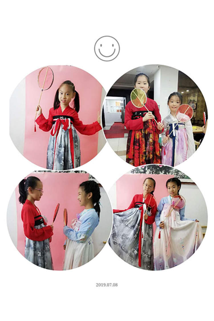 听完老师耐心细致的讲解,孩子们按耐不住跃跃欲试。制作团扇,需要耐心细致、审美情趣,更需要互相帮助。孩子们安静有序,全部制作成功。有了漂亮的团扇,怎么能没有美丽的衣裳来配呢?老师们特地为孩子们准备了汉服,来个换装走秀体验吧。