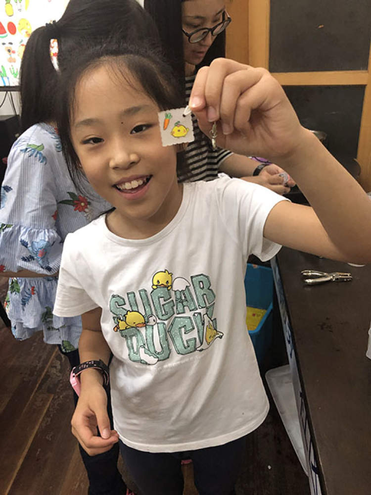 先在热缩片上画一幅画,草莓、胡萝卜、青蛙……开始动手制作“会缩小的塑料画”啦!用热风枪对着塑料画吹,“超级变变变,画变小了呢!”在塑料画上打个小洞,把龙虾扣绳穿进去,瞧,塑料画做成可爱的小挂件了,棒棒哒。