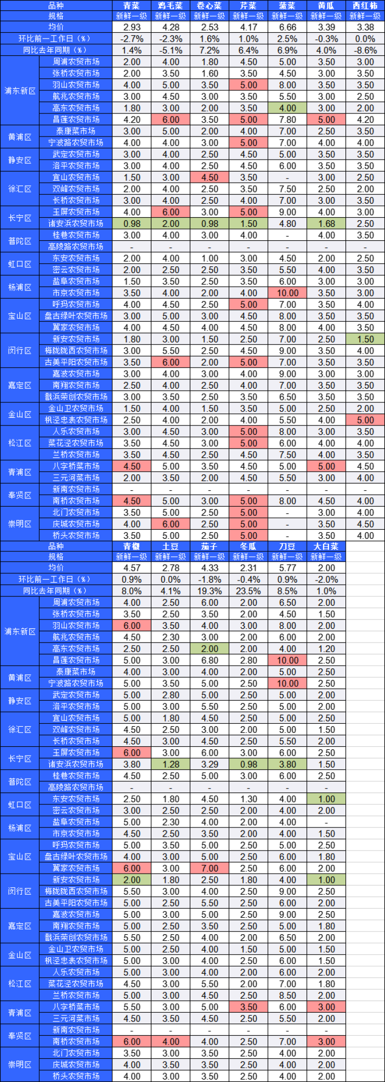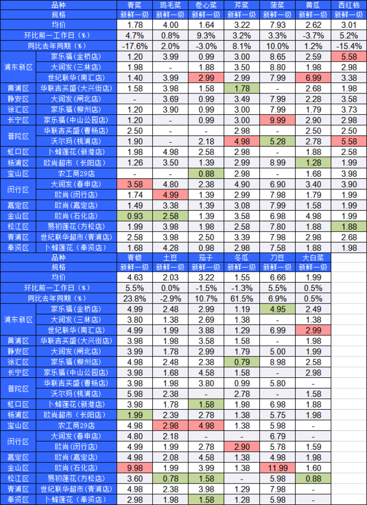 ■粉底标注代表该蔬菜品种在上述农贸市场或超市的最高价;绿底标注代表该蔬菜品种在上述农贸市场或超市的最低价
