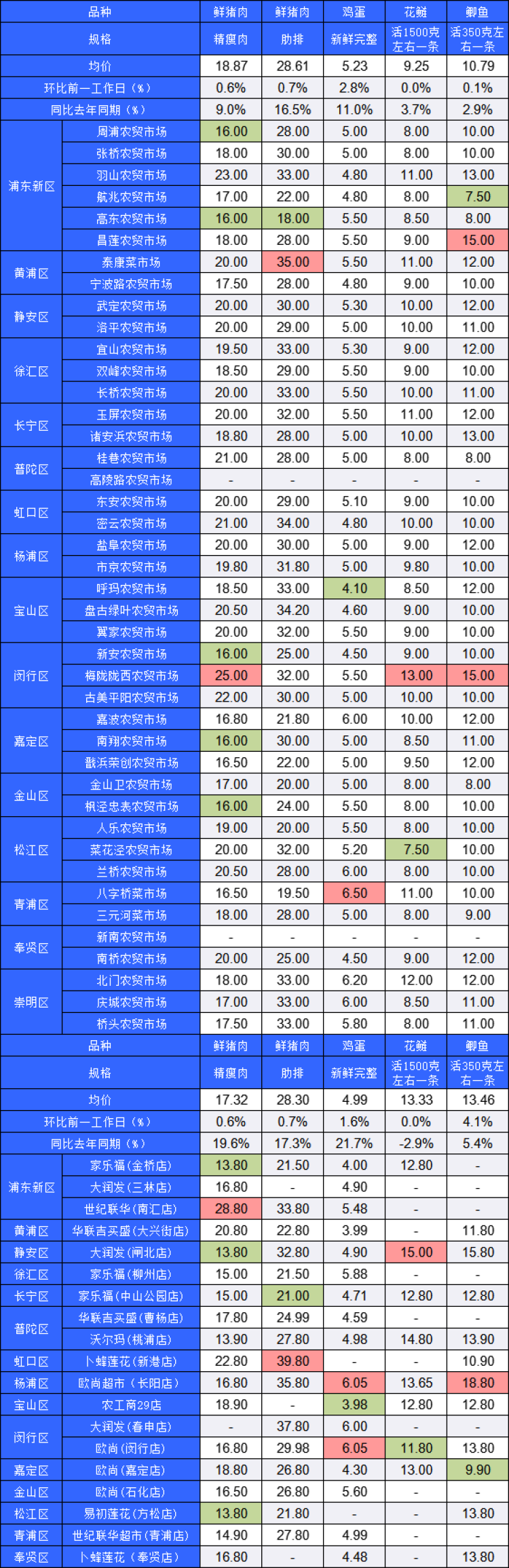 ■粉底标注代表该肉蛋鱼品种在上述农贸市场或超市的最高价;绿底标注代表该肉蛋鱼品种在上述农贸市场或超市的最低价