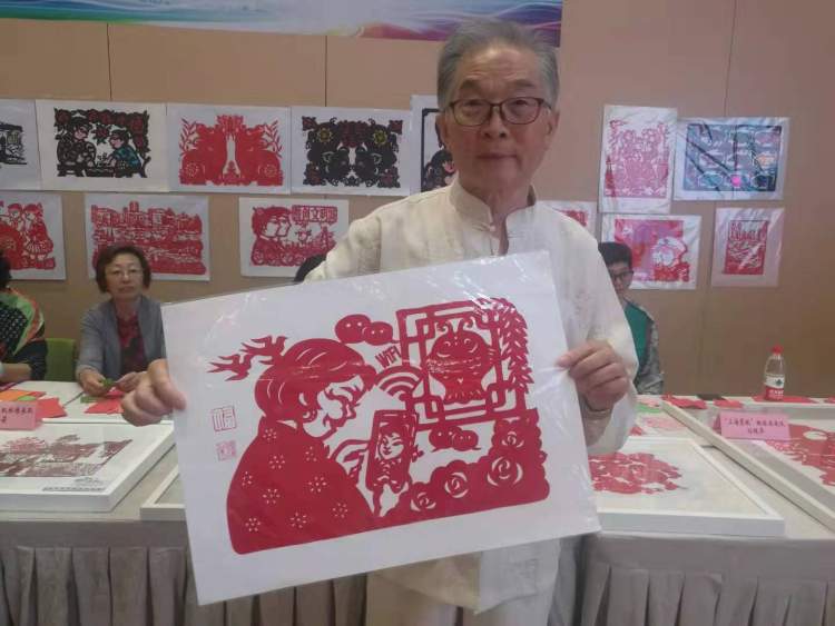在今天展示现场,展示了“上海剪纸”区级非遗传承人孙继海这两年的拿手作品50多幅剪纸,展示作品既有时代性,又极具创意。其中一幅“视频聊天”剪纸,通过老太拿着手机与远在千里之外的孙辈通话场景,让人感受到改革开放40年来,我们国家发生了翻天覆地的变化。