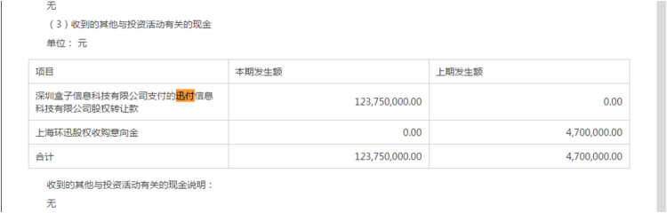 2018年6月,盒子科技收购石基信息所持环迅支付的股份未获央行批准,石基信息仍为环迅支付的第二大股东。石基信息在2018年年报中称,北海石基向深圳盒子信息出售所持迅付信息22.5%股权事项因尚需中国人民银行审批,目前尚未完成交割手续,故出售日及出售该部分股权对公司财务数据的影响等情况目前无法确定。