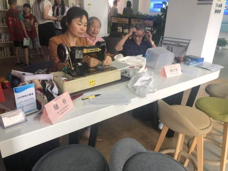 同一时刻,便民区的缝纫机已经开始运作。八九个退休阿姨围坐在圆桌前编织缝补。图书室内,有阅读报刊书籍,也有居民打着蒲扇下棋饮茶。中午11点,是食堂最为热闹的。“一大荤一小荤一素一饭一汤,60岁以上老人只需11元。”目前,片区办理60岁以上老人餐卡充值数达到900多张,还吸引了许多户外劳作工人和周边白领前来就餐。