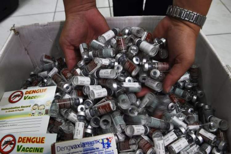 ■ 菲律宾马尼拉当地的医护人员展示登革热疫苗(资料图)