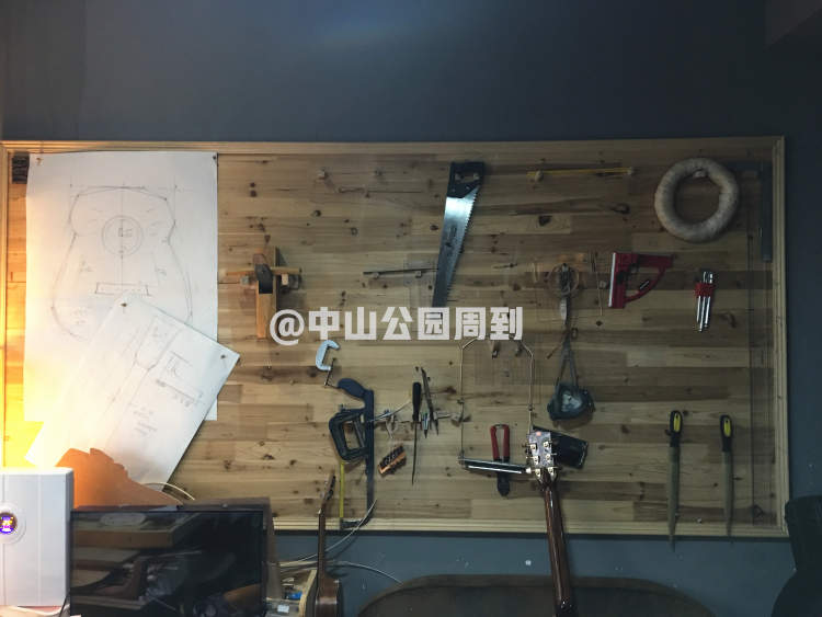 房间的装修足见汤木的用心,几乎每一个角落都可以看见木头。一扇巨大的落地窗面朝马路,窗前的大木桌上堆着各种木头和做琴的工具,还有些许琴的半成品;桌子的左边是一个用于储藏工具的木柜,右边则是一块大的木板,上面钉着设计图。房间的角落还放着一把刚做好的吉他,只差上色和抛光。看似杂乱无章却又充满了生命力。