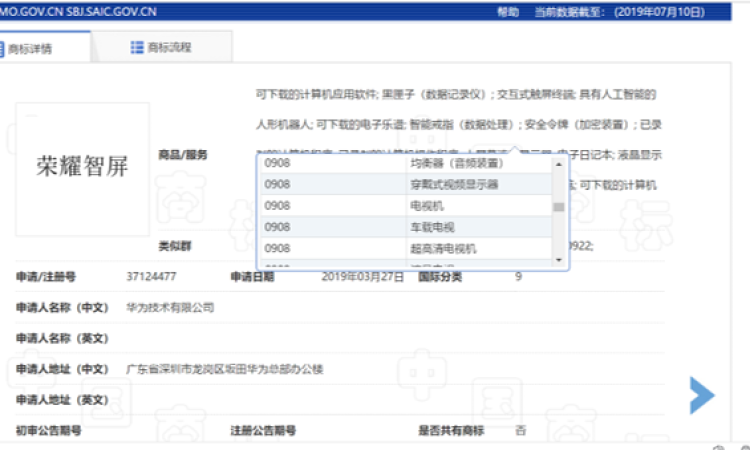 而后7月12日,荣耀提交了数个新商标,包括“荣耀智慧大屏”、“荣耀智屏”、“荣耀智慧屏”等商标。其中“荣耀智慧大屏”涵盖了机顶盒等商品。而“荣耀智屏”则直接涵盖了“电视机”“超高清电视”等商品品类。