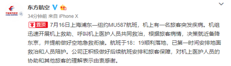 今天,上海浦东—纽约MU587航班,机上有一名旅客突发疾病。机组迅速开展机上救助、呼叫机上医护人员共同救治,根据旅客病情,决策就近备降东京,并提前做好空地急救衔接。航班于18:19顺利落地,已第一时间安排地面救治和人员陪护。