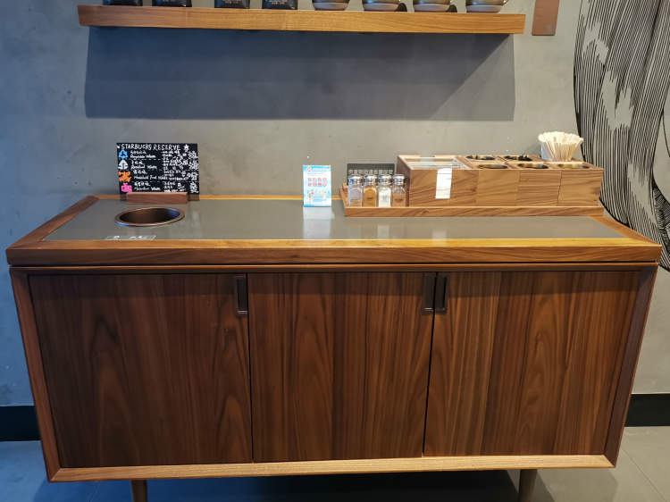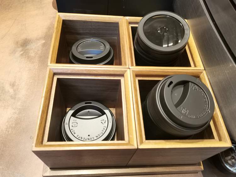 周到君在店内看到,自助服务区收起了装吸管的桶。目前店内所使用的外带杯盖都为可回收杯盖。