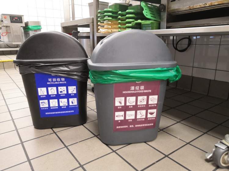 后厨的垃圾设为干垃圾,湿垃圾和可回收垃圾。根据分类指南,工作人员会将空酱罐,锡纸等丢弃在干垃圾,咖啡渣、蛋壳等丢弃在湿垃圾,蓝白手套、外包装塑料袋丢弃在可回收垃圾。