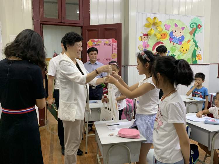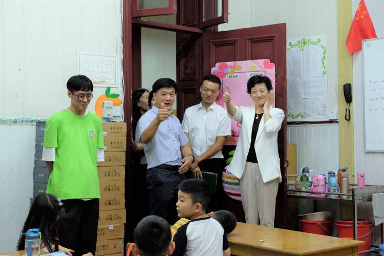 随后,虹口区领导走进暑托班课堂,只见孩子们刚上完“21天看世界”课,正围着老师七嘴八舌地谈论英国和丹麦的有趣,并猜测着下一节课会去哪里。看着孩子们开心的笑脸,领导们高兴地同老师及小朋友们亲切交流,询问他们在爱心暑托班里的感受和体验,并送上清凉慰问品。