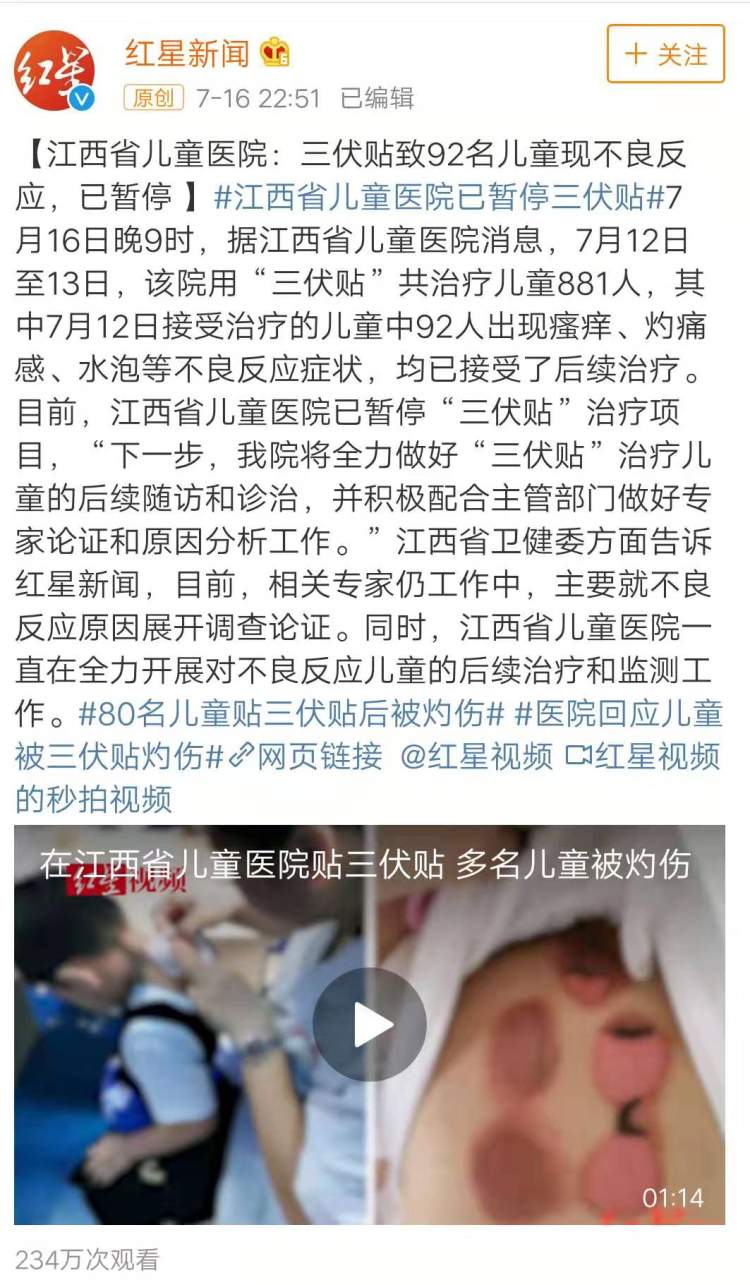 据红星新闻报道,近日在江西省儿童医院用“三伏贴”治疗的儿童中,有92人出现瘙痒、灼痛感、水泡等不良反应。