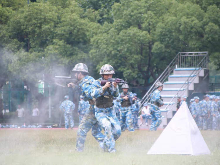 这个让在场师生大呼过瘾的“战斗演练”环节,参训学生经过近十天的训练,已然可以达到一名普通战士的基本素养,掌握了班组战斗进攻的基本动作和程序。通过战斗模拟演练,把日常训练中的动作要领真实展现,也是此次军训的一大亮点。