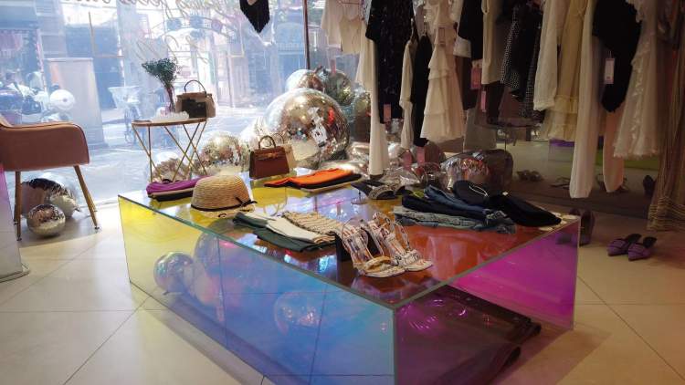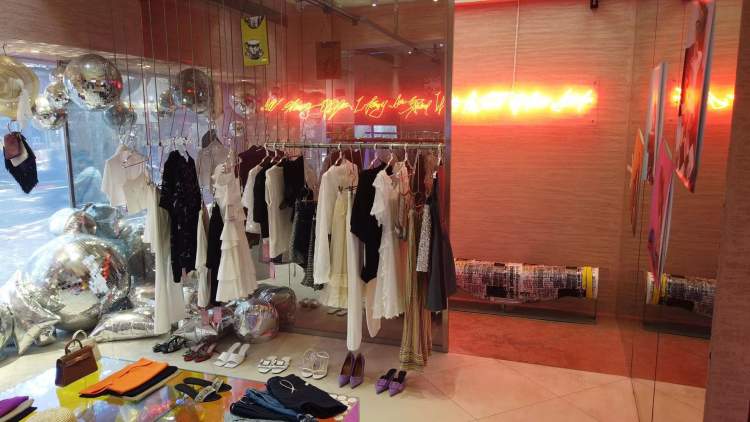 70平方米的面积至少是其他服装小店的两三倍,设计店面时专门请了野兽派的设计师,店里除了衣架、陈列桌,还有很大一部分面积被用于放置粉嫩嫩的沙发和亮闪闪的迪斯科球。