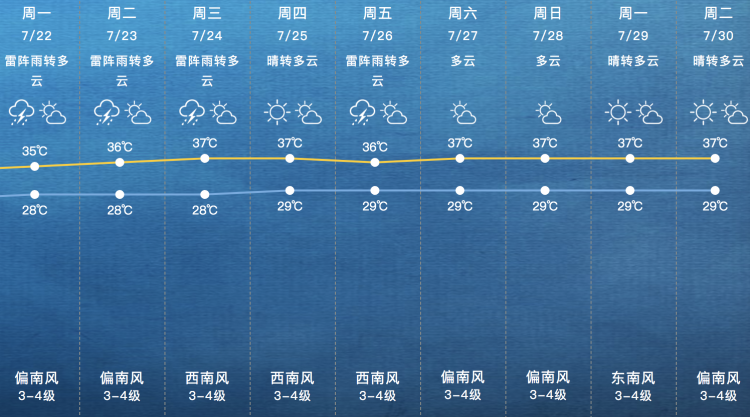 预计明天继续冲击高温线,最高气温在35℃;后天为36℃左右。