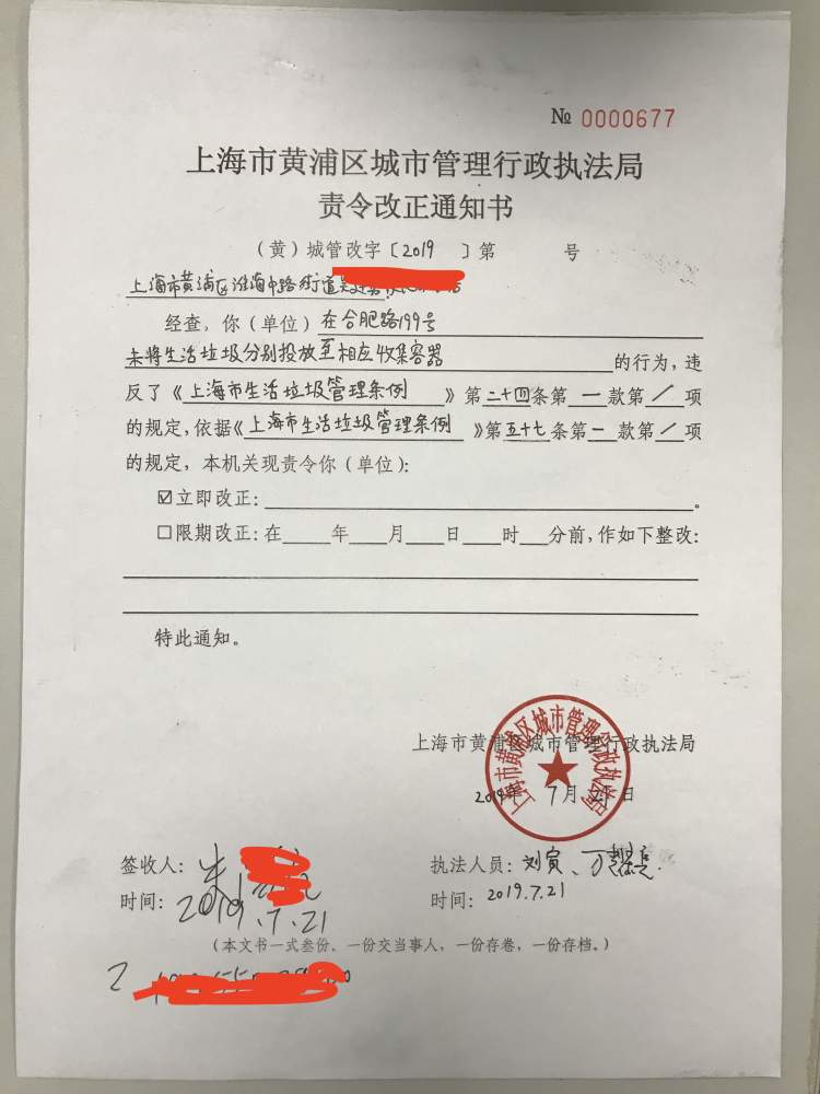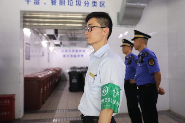 淮海中路街道城管中队主任科员骆浩全介绍,淮海中路辖区商务楼宇密集,餐饮企业有300多家,针对这一情况,城管将垃圾分类的执法重点放在了投放以及驳运环节,“从7月1日《条例》实施至今,我们已经开具19张责令整改通知书,其中1家餐饮企业经复查仍未整改,被开具罚单。”