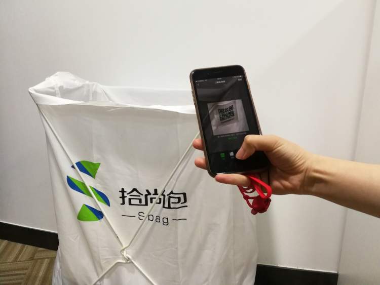 在兰生大厦办公区的可回收物投放点,挂着一个印有“拾尚包”字样的白色袋子。兰生大厦物业管理公司垃圾分类项目负责人朱洁茹介绍,这个“垃圾拾尚包”是针对可回收物的小创意,一般由单位或商户自行设置在公共区域内,类似干净的纸板箱、饮料瓶等可回收物,都可以投放到里面。袋子上有一个二维码,扫一扫就可以绑定公司账户,就能实现线上预约线下回收,每次交付投递的垃圾,也能做到源头追溯。
