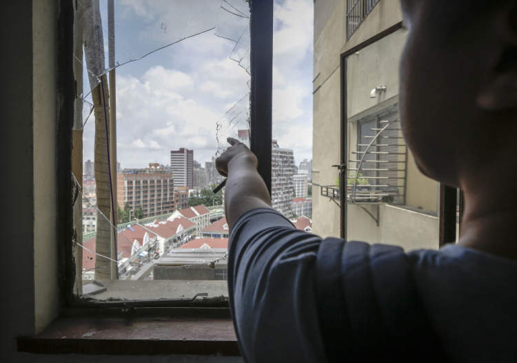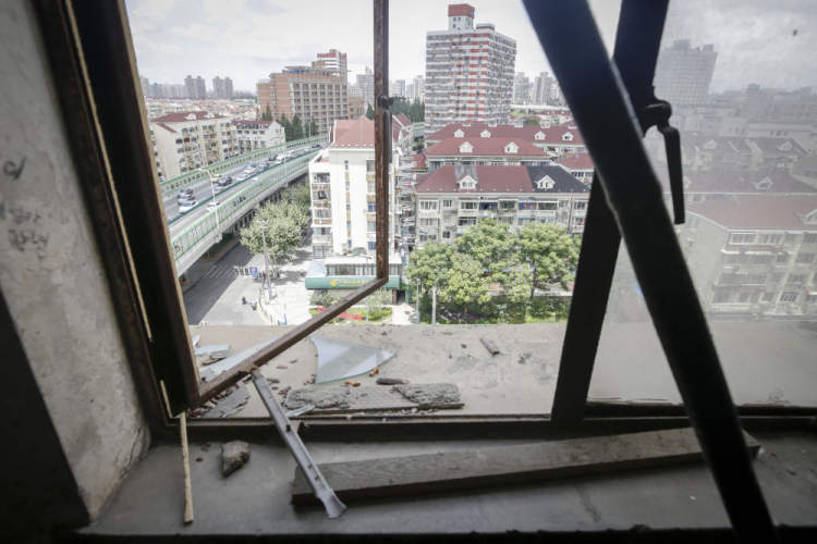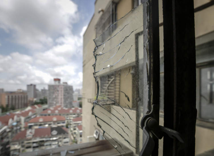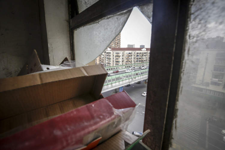一楼临街的窗户玻璃已经完全消失。二楼至三楼楼道内上推外开窗的挂钩已经掉落,窗体随风摆动。四楼沿街的窗扇则在破损的情况下保持打开状态,比成人手掌还要大的三角形玻璃碎片,悬在窗子的外沿上。在10层,同样破损的窗扇开启着,大大小小的玻璃碎片悬在窗户外沿,看上去只需一阵风,就能将玻璃碎片从10楼吹下。