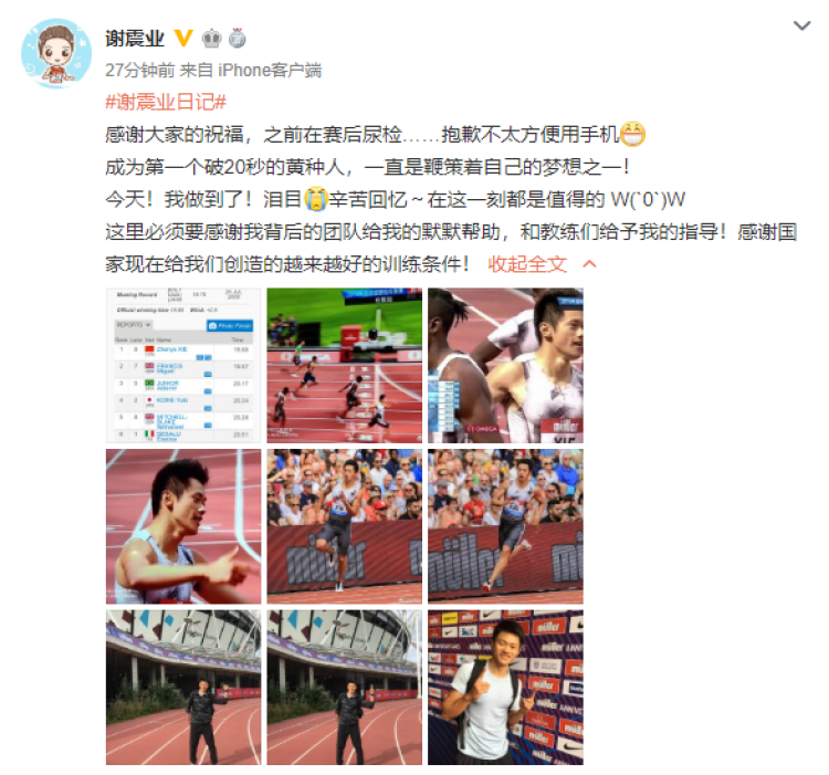 赛后,谢震业在微博上发表感言,感慨梦想成真。“成为第一个破20秒的黄种人,一直是鞭策着自己的梦想之一!今天!我做到了!”
