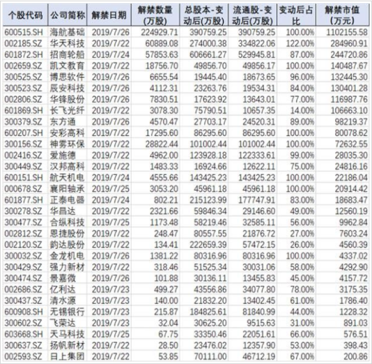 7月26日,新增流通股6.09亿股,占总股本22.22%,股份类型为配股股份。以上周五收盘价计算,解禁市值28.50亿元。