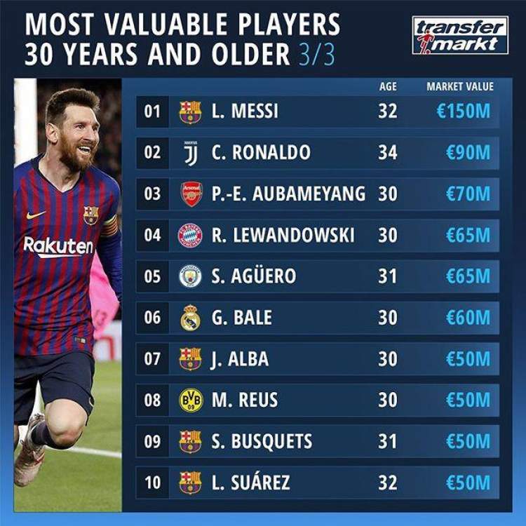 32岁的梅西以高达1.5亿欧元的身价排名第一,他也是这份榜单中唯一一位身价过亿的30+球员。C罗以9000万欧元排名第二,但他也是在这份排行榜上年龄最大的球员,葡萄牙人今年已经34岁。排名第三的是30岁的阿森纳射手奥巴梅扬,身价为7000万欧元。拜仁神锋莱万,以及曼城射手阿圭罗都是6500万欧元。