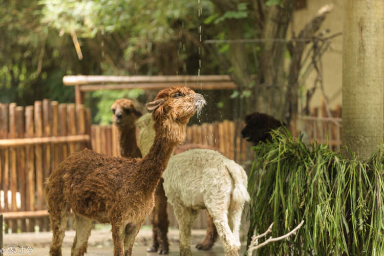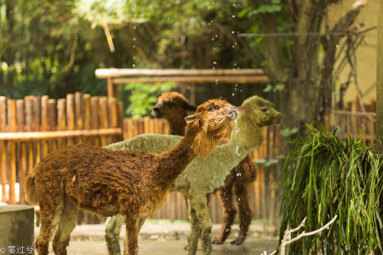 咦,"神兽"羊驼呢?原来,它们的小团体都躲入展区中间的凉亭下乘凉呢,宽大的凉亭为“神兽”提供了很好遮阳场所,而且凉亭下带有食槽,外加饲养员们适时开启了喷淋,羊驼们享受着“及时雨”,饿了吃些鲜嫩草料,渴了喝些水润润喉,就算酷暑来了也不怕。如果觉得累了,还可以去旁边的小木屋打个盹儿。