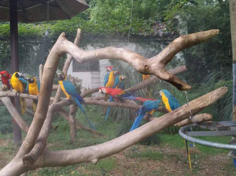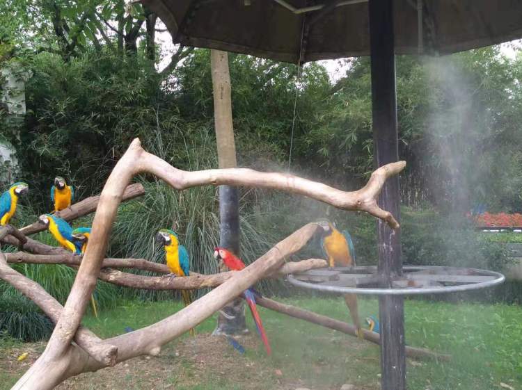 比如:安装黑色遮阴网,可以有效减少阳光直射和透过率,同时也可以减缓雨滴的直落速度,减少对动物造成的应激。雨季笼舍室内会很潮湿,风扇在通风降温的同时也可以加快地面水分挥发,有效降低室内湿度。喷淋主要用于鹦鹉岗位,因为鹦鹉身上羽粉较多,需要定期进行清洗,每次喷淋一开,金刚鹦鹉和葵花凤头鹦鹉等就会抢占喷淋正下方的有利地点,展开双翅摇头晃脑,洗个痛快。其它一些笼舍会通过增加绿化种植来创造不同的小环境,比如孔雀、灰翅喇叭鸟、巨嘴鸟等,密植的植物和树冠筛掉了大部分的直射光,躲在灌丛中的喇叭鸟和树冠中的巨嘴鸟看起来毫无压力。