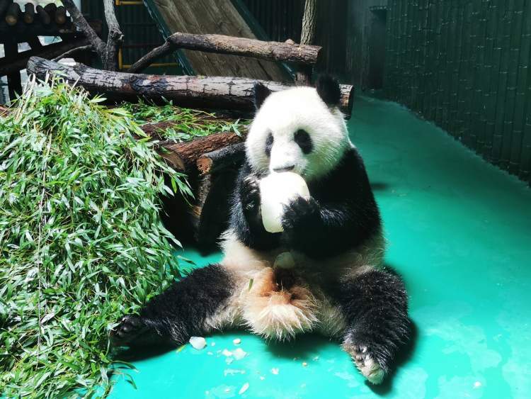 早餐后,趁着气温还没太高,还能在树荫下的栖架上美美睡上一个回笼觉。一觉睡来,有点热了,就该回去孵空调了。空调房内,夏季限定的水果冰自然必不可少的,展区里还悬挂了不少苹果片,供大熊猫取食,既好吃又好玩,风光兄弟”真是乐不思“暑”啊。