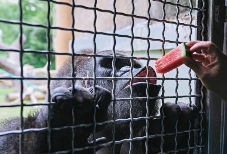 大猩猩是来自赤道雨林的王者大金刚,原本有着对闷热潮湿的天然抗力,但是上海的三伏天确实给了这些非洲土著一个下马威,高温让它们无精打采地“葛优躺”,瞧那一身黑毛多吸热啊,但是室内的空调“拯救”了它们,适宜的温度,加上饲养员们的悉心照顾,也是美滋滋的,饲养员还亲手特制了蔬果棒冰,味道真心赞!当然考虑到动物肠胃健康,果蔬冰块根据每天具体的气温情况,限量提供。望着大猩猩们乐享夏日甜品,外面的游客们不禁投来羡慕的眼光。