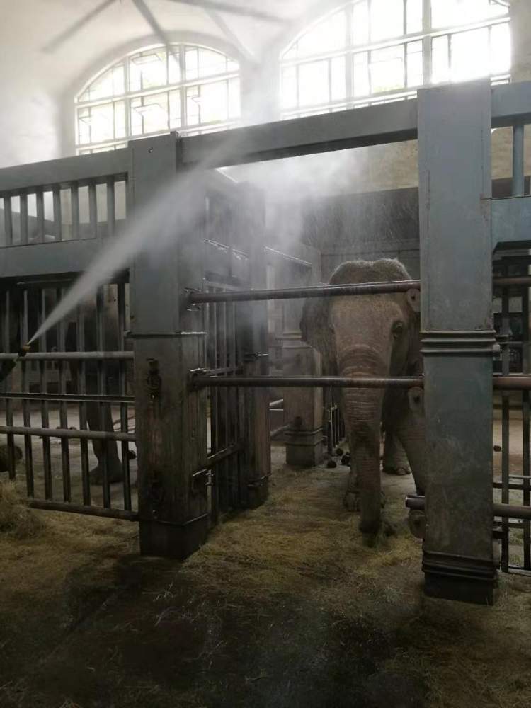 说起上海动物园的代表,莫过于食草动物中体型最大,也最为帅气的大象了,燥热的天气让平时调皮的大象莫莫也老老实实地待在室内,等待饲养员们为它喷水降温,喷完一面它会很自觉的转过身来让你喷喷另一面。除了洗澡外,每日两次的西瓜也必不可少。