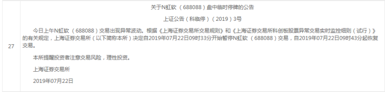 招商证券专家举例说明,如某股票开盘价为10元,当日盘中成交价首次达到13元、16元或是下跌至7元、4元时,会触发盘中临时停牌。一只股票在极端情况下,每日最多会触发4次盘中临时停牌。往上涨30%和60%时各停一次, 往下跌30 %和60%时各停10分钟。此后如果再涨跌多少,也不临时停牌了。而22日25只科创板均接连上涨,所以有7只新股两次临时停牌。此外,虹软科技开盘后不久股价下行引发停牌,当时一些人在交易大厅认为因高开了,但其后走势平稳。