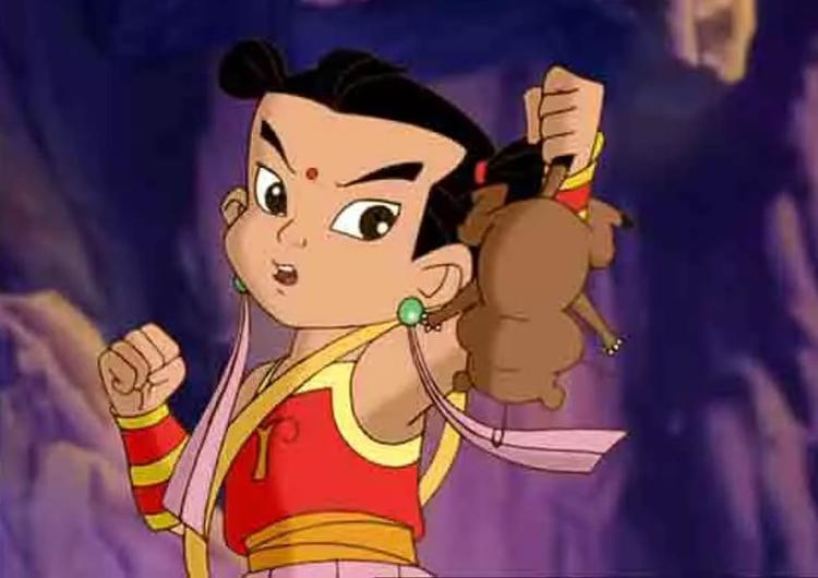 把平面世界想象成立体世界,扑克牌变成战争机器的表达方式到了《哪吒》里就成了师徒二人在千里江山图里练功学艺。马良神笔随时随地变出江川瀑布、冰石花木,师徒二人乘神笔如阿拉丁魔毯,畅游山河千里,蔚为壮观。