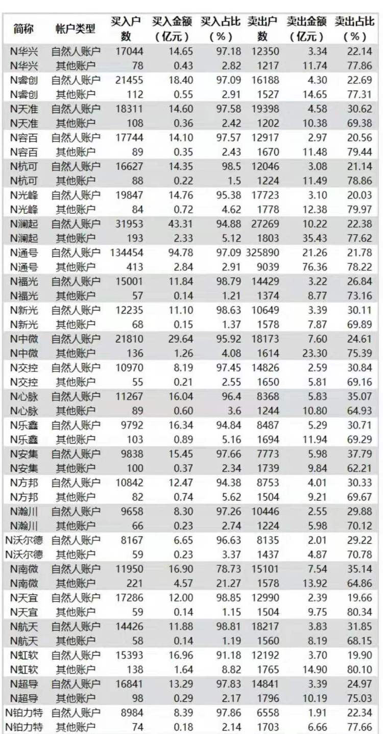 南微医学是唯一买卖前五席位均为机构的个股。其中前5买入席位合计买入279.98万股,买入金额2.71亿元,平均成本为96.79元,而南微医学收盘价110.51元;前五卖出席位合计卖出262.41万股,兑现2.9亿元资金,平均卖出价格与收盘价一样,这部分配售到新股的机构获利1.52亿元。