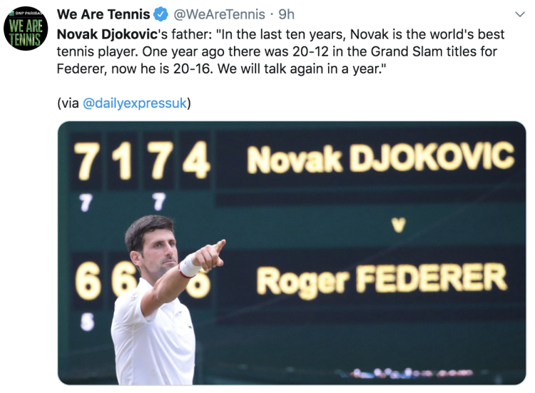 德爸认为,自2009年以来费德勒并非世界上最好的网球运动员,他的儿子才是;另外,他的儿子诺瓦克将会在2020年超越费、纳二人,领先大满贯排行榜。