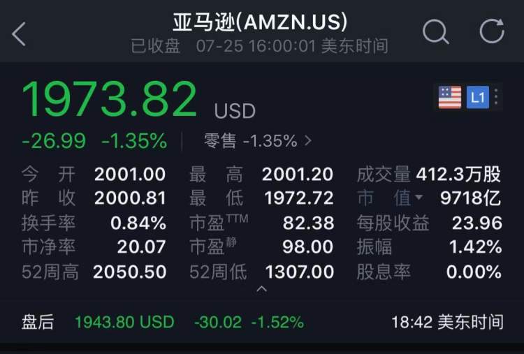 云计算增幅放缓和在线零售成本上升,拖累了亚马逊二季度的财务表现。在其刚刚公布Q2财报中,净利润增速与上一季度环比下降了26.3%。消息公布后的盘后交易时段,亚马逊股价下跌1.35%,报1973.82美元。