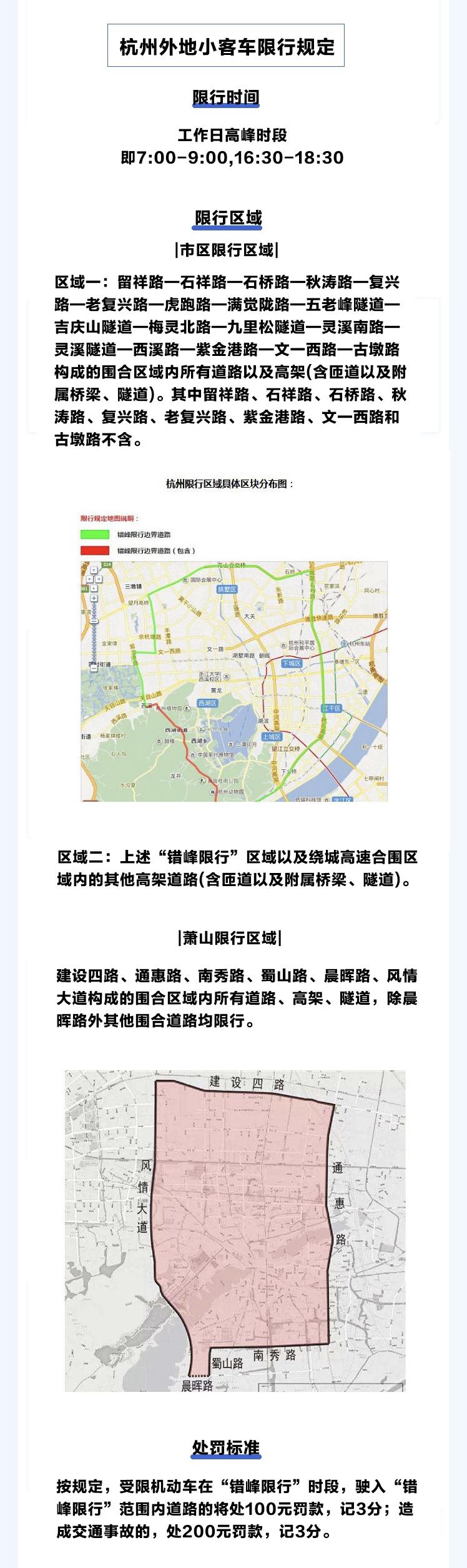 具体来看,原本杭州外地小客车的限行规定包括早晚高峰、市区及萧山部分区域,违规者将处于100元罚款和记3分的处罚。