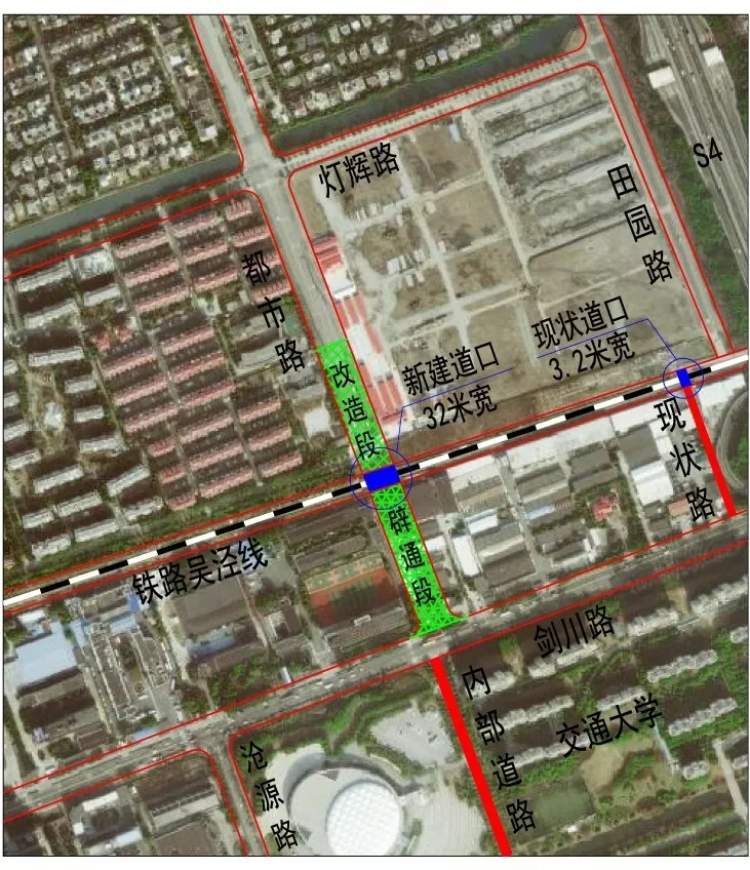 此次都市路新建工程北起灯辉路以南,南至剑川路,全长391.12米,道路等级为城市支路。由于原都市路受铁路吴泾线影响,在铁路处形成断头路,打通工程将采用平交方式穿越铁路吴泾线。