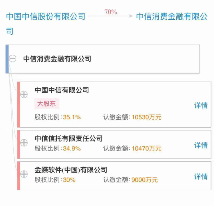 根据此前的公告显示,该公司注册资本为3亿元人民币。中国中信有限公司出资1.053亿元,持股35.1%;中信信托有限责任公司出资1.047亿元,持股比例为34.9%;金蝶软件(中国)有限公司出资0.9亿元,持股比例为30%。