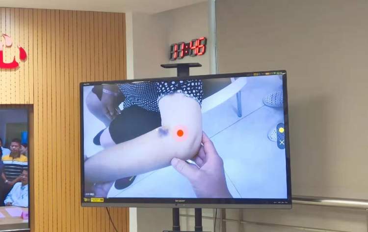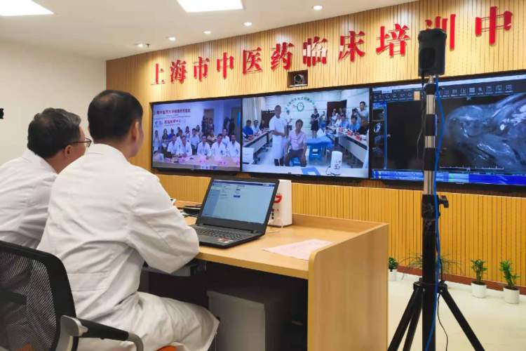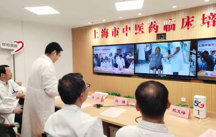 经过认真分析和热烈讨论,龚利制定了以“坐位调膝法”为主的治疗方案,并在上海,在实时5G网络下演示传授“坐位调膝法”特色推拿技术。