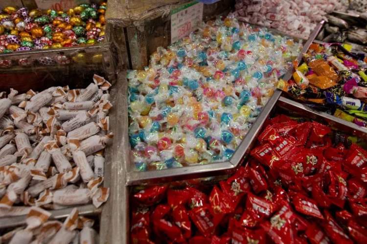 一格一格的玻璃方缸内,散装糖果、南北货腌制食品、熟食蜜饯小零食、老字号点心……各种食品堆得扑扑满满,让人目不暇接。