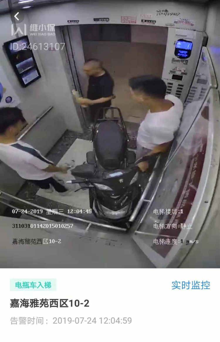 为了堵住小型电瓶车上楼的漏洞,嘉海雅苑所有居民楼的电梯又安装了一种新设备。这种设备可以根据电梯内的画面自动识别,一旦监测到有电瓶车进入电梯,就会发出提示音“电瓶车不得进入电梯”。