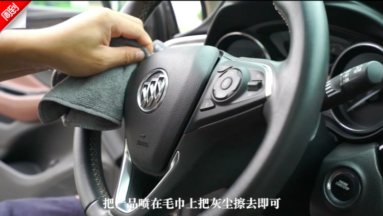 Step3: 将清洁剂喷于干毛巾上擦拭中控屏、按键、档把、方向盘等区域