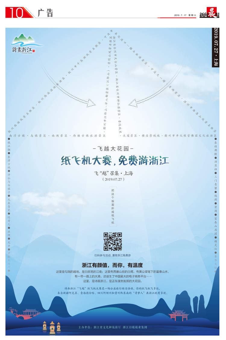 上周六,“飞越大花园”诗画浙江公益助力活动来到上海啦!此次公益助力活动采取“纸飞机大赛,免费游浙江”的形式,5位优胜者不仅可以为自己赢得价值超过5000元的免费浙江之旅,还能为来自诗画浙江对口省市的“浙里家人”累积来诗画浙江学习体验的里程,助力他们圆梦。