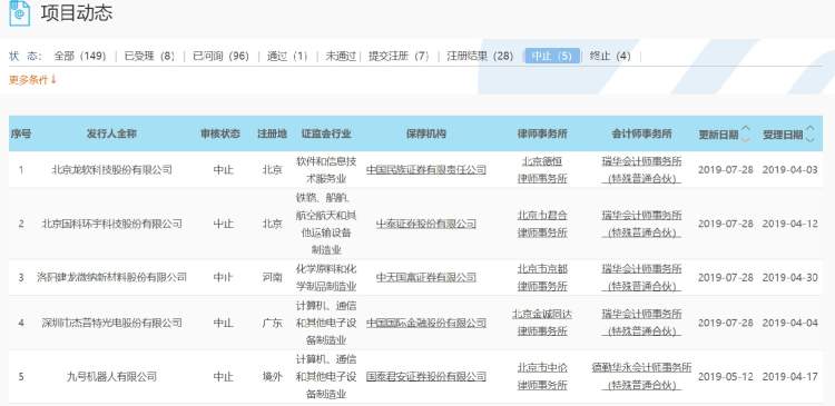 除了四家公司被终止审核外,由于审计机构瑞华所被中国证监会立案调查,7月28日上交所对杰普特、国科环宇、龙软股份、建龙微纳4个科创板项目中止审核。